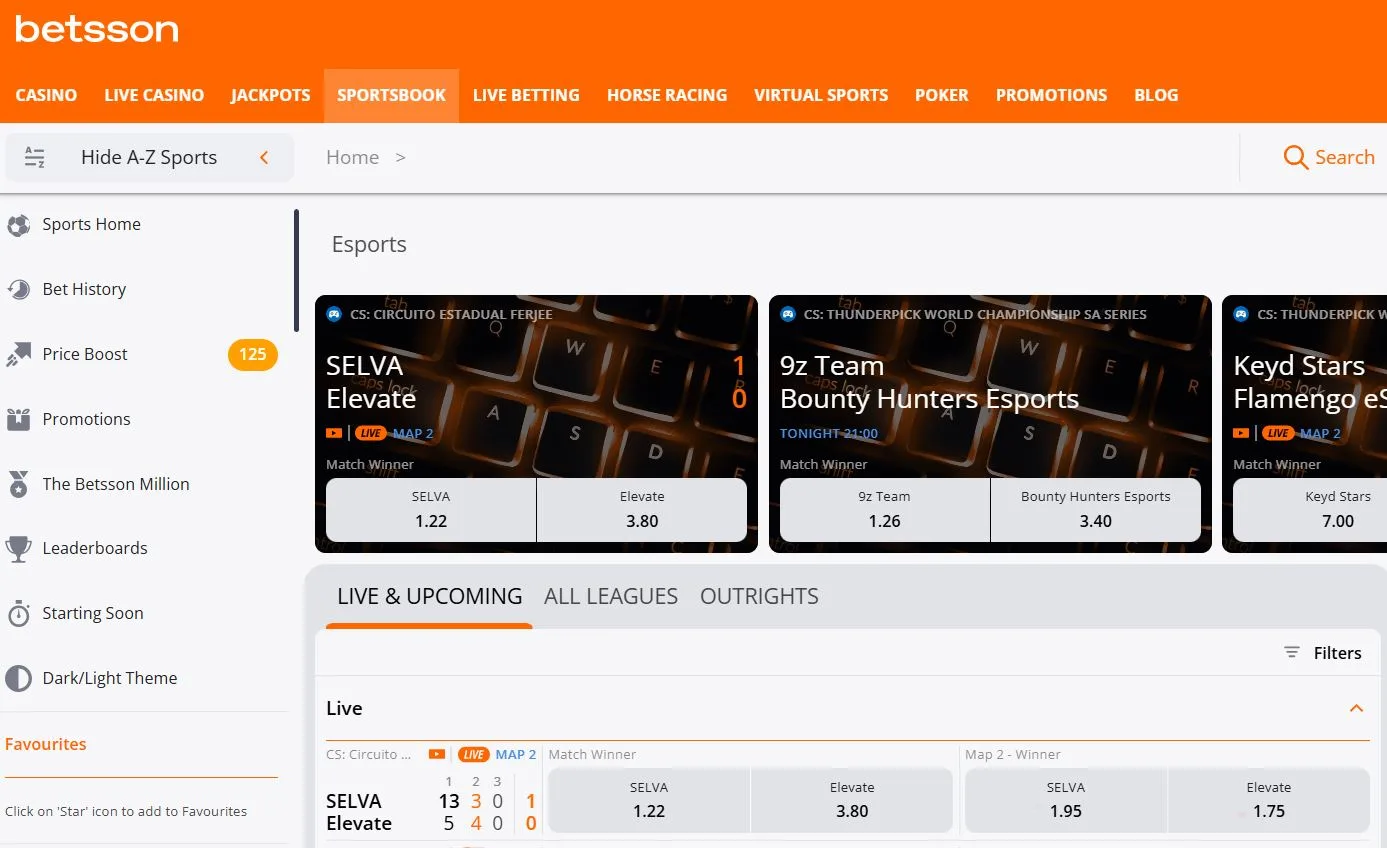 You can find the eSports tab and all available games in the sportsbook section. On any given day, there can be 20+ live and upcoming matches open for betting across the Betsson eSports section. It covers all the major tournaments, including:
