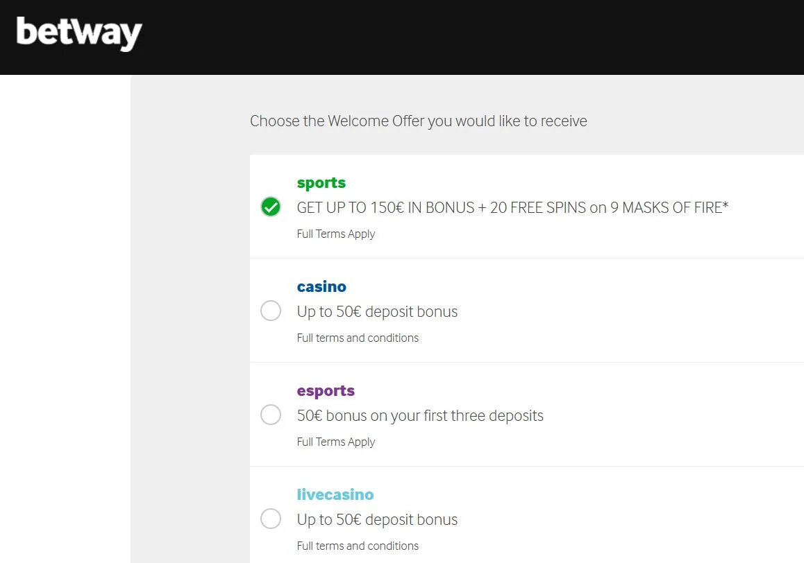 - Choose the Betway welcome bonus. Choose one of the five options offered by the bookmaker. Only two of them (Sports and eSports) are dedicated to the Sportsbook section.