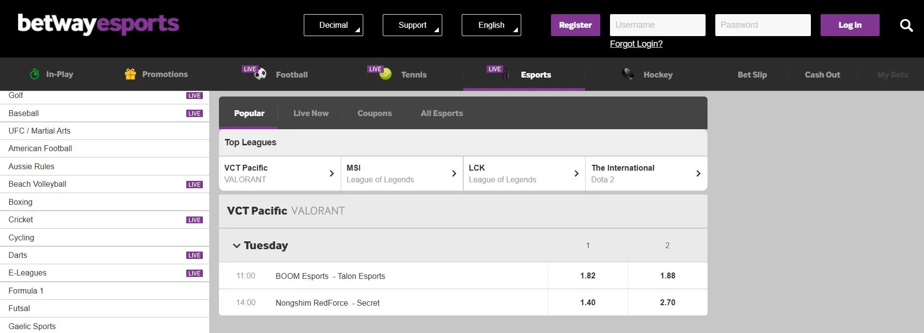 The live betting section is one of the strongest sides of the Betway website. For many events, especially football and tennis, live streaming is available directly on-site for registered users. Esports matches often feature integrated streams (like Twitch or YouTube), allowing you to watch and bet in one window without switching platforms.