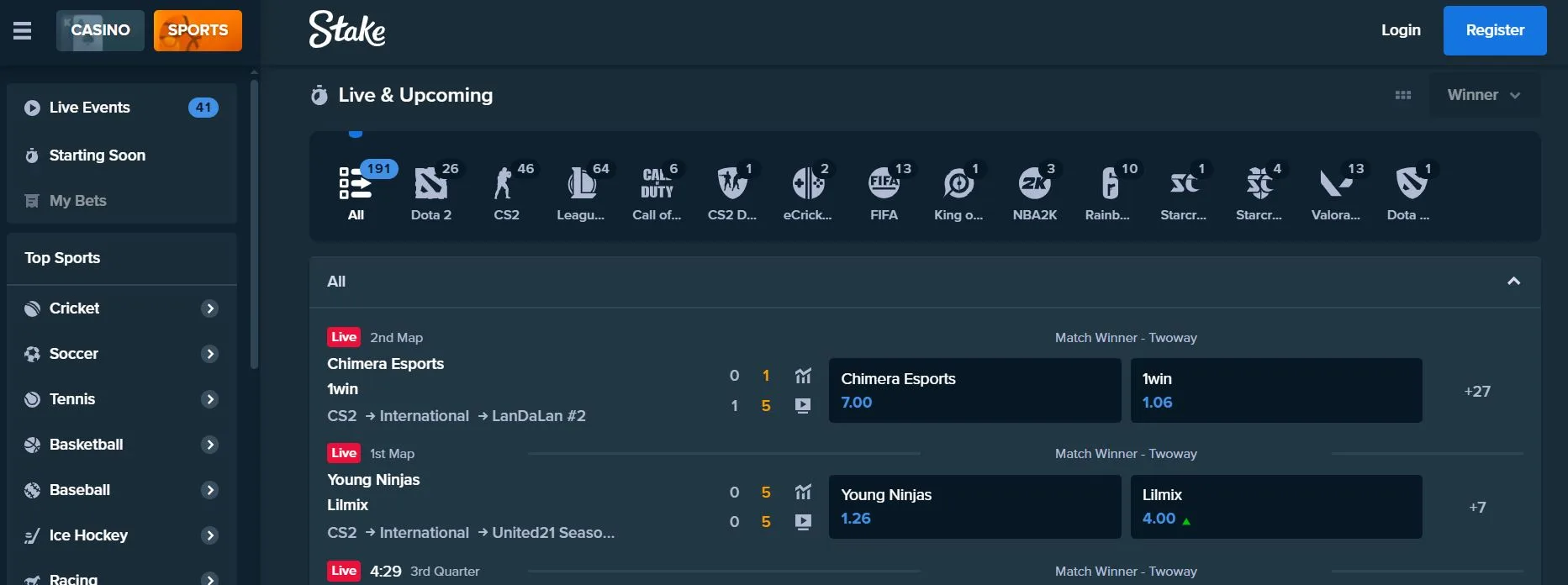 Stake’s live betting platform is one of the most dynamic and responsive in the crypto betting. It highlights key stats, map progress, player performance, and score lines, all without clutter. You can choose all Live events at once by clicking on the Live button. Then, you can choose a specific discipline.